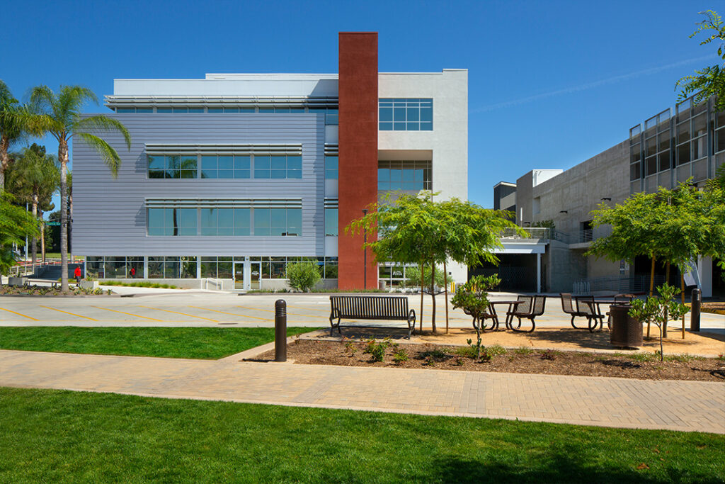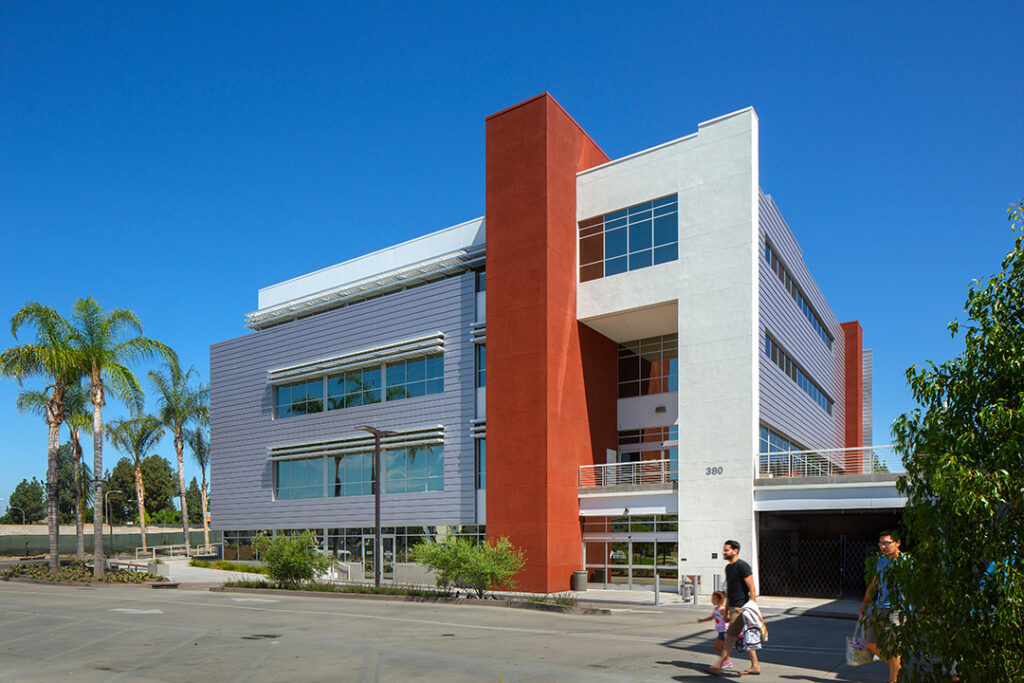 Set back and stepped up from the street, the building maintains a presence on Central Avenue and connects to a convenient parking garage at the rear. Intersecting the glass and metal panel façade, a bright orange plane acts as a billboard for both the medical offices and the larger community.