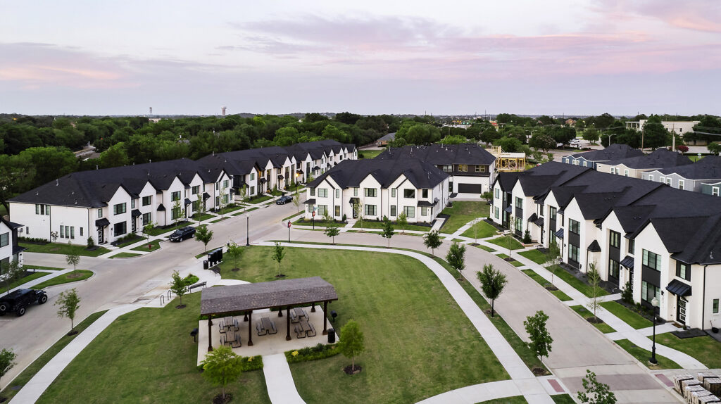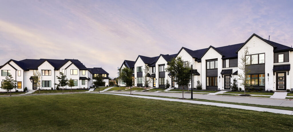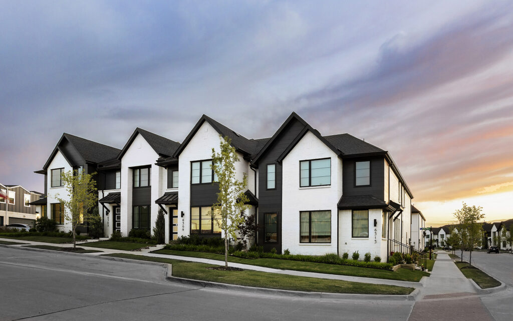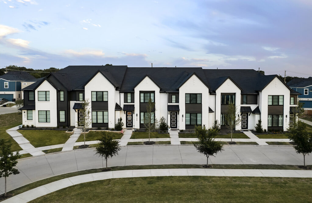 Located in a new townhome community, the Urban Trails collection features modern two-story townhomes with five varied floor plans. Painted white brick and black windows offer a strong contrast and interest to the streetscape.