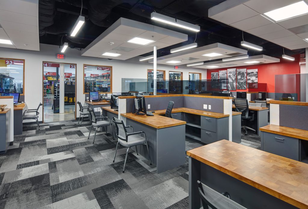 The renovation of the occupied and fully-operational store required a Rubik’s cube of construction with 15 phases over 14 to 16 months. The redesign created a layout that more efficiently organized Ganahl’s product, achieving much more out of the same concrete shell. Opening up the ceilings in the sales offices increased height and volume in the space while the addition of five new punched windows provided more natural light and views to the outside from the sales floor.