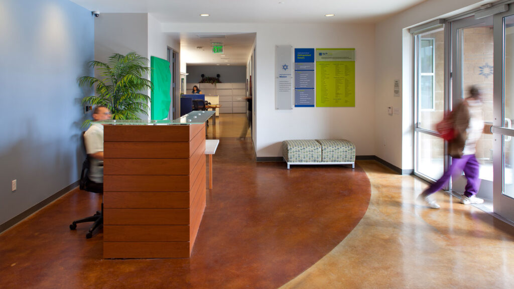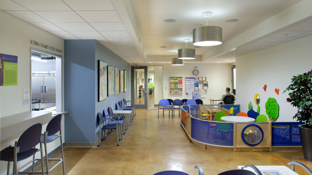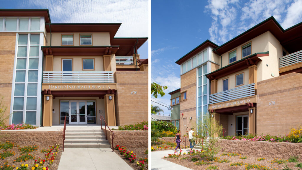 We collaborated with Harbor Interfaith Services, a non-profit organization in Los Angeles, to create a 14,000-square-foot family resource center. The design consolidated all program requirements into one building, utilizing adjacent parcels. The three-story structure includes a resource center, play areas, offices, and underground parking while respecting the residential neighborhood’s scale and style. The design prioritizes social and environmental sustainability, aiming for LEED certification, with efficient fixtures, recycled materials, and energy efficiency.