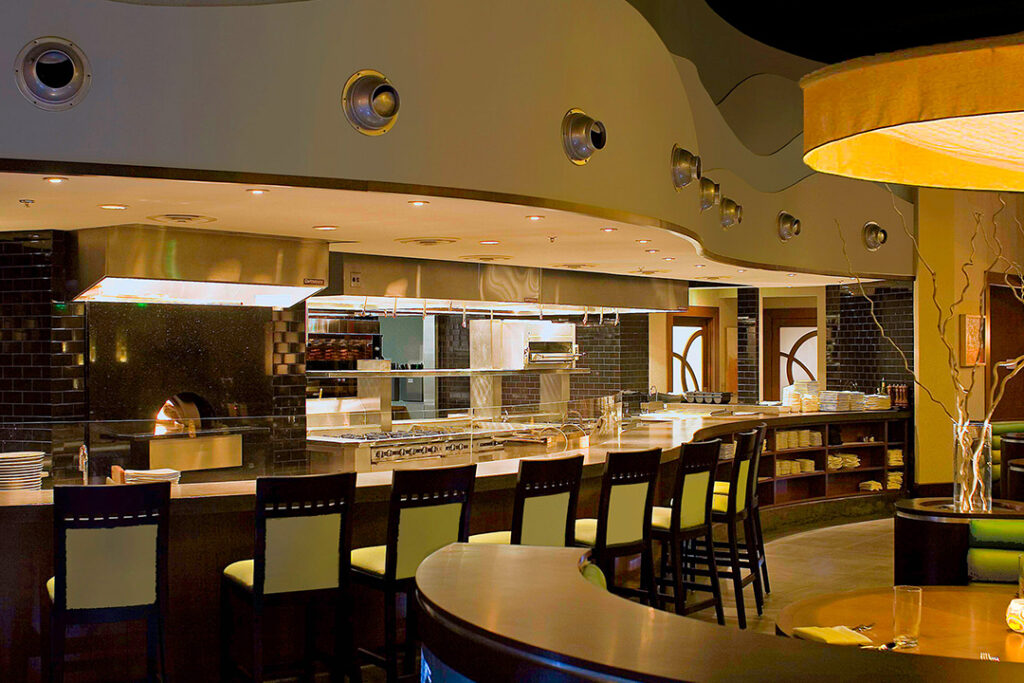 This 300 seat modern Italian restaurant and bar was designed for a first generation chef from Acireale, Italy and his son, a sommelier. Warm rich materials and flowing curved forms move between sculpted architecture that represent natural elements. A theatrical expo kitchen opens to the voluminous bar and dining rooms; and as such, there was close attention, during the design process, to control both light and sound. This ensured that the visually dynamic space would deliver an intimate guest experience.