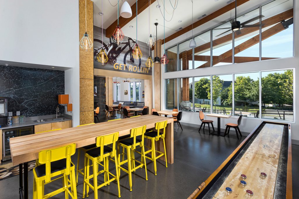 The overall interior aesthetic was driven by the desire to capture the local active outdoor energy. Amenity spaces are designed as extensions of the residential units, with the same tones, style and materials that focus on responsibly-sourced and durable products. The developer worked with our interior design team to salvage almost 14,000 linear board feet of maple hardwood from the trees on the property, which was used for custom furniture and trim that spoke to the importance of the natural surroundings while leaning into an edgy, industrial vibe. Warm tones were punched with vibrant autumnal colors of golds, oranges, and rust, to bump up the volume in community spaces.