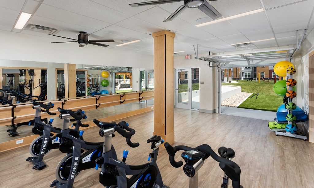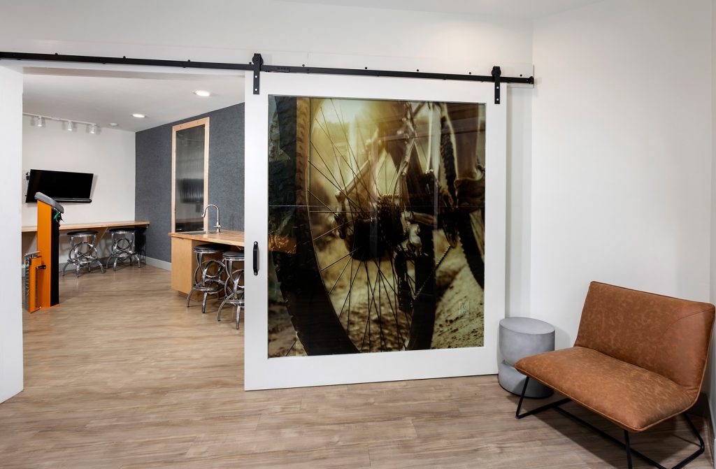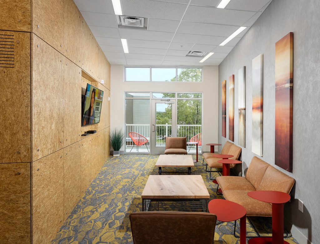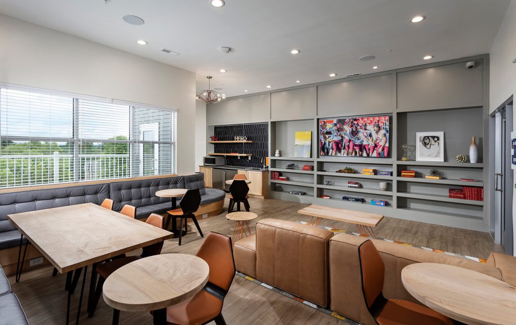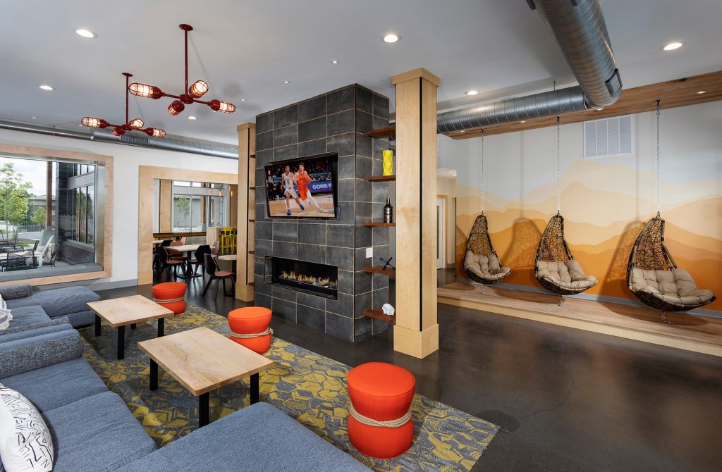 The overall interior aesthetic was driven by the desire to capture the local active outdoor energy. Amenity spaces are designed as extensions of the residential units, with the same tones, style and materials that focus on responsibly-sourced and durable products. The developer worked with our interior design team to salvage almost 14,000 linear board feet of maple hardwood from the trees on the property, which was used for custom furniture and trim that spoke to the importance of the natural surroundings while leaning into an edgy, industrial vibe. Warm tones were punched with vibrant autumnal colors of golds, oranges, and rust, to bump up the volume in community spaces.
