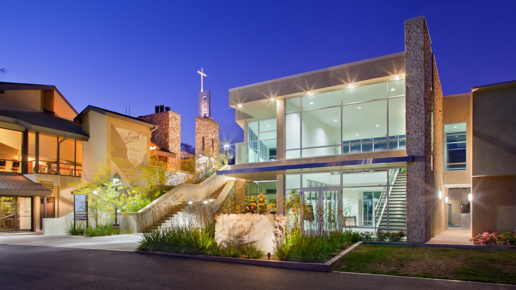 Rolling Hills Covenant Church’s 11-acre campus is divided into two main parcels: North Campus with a chapel and South Campus with the central sanctuary and welcome center. At the heart of the South Campus, an expansive, outdoor fellowship deck was added that encourages greater socialization by connecting all of the key buildings: sanctuary, welcome center and the newest facility, the children’s welcome center and administration building.