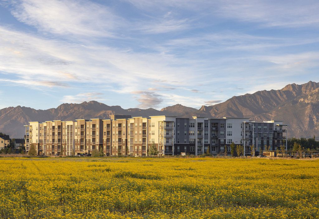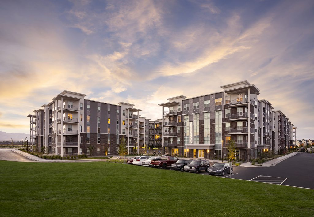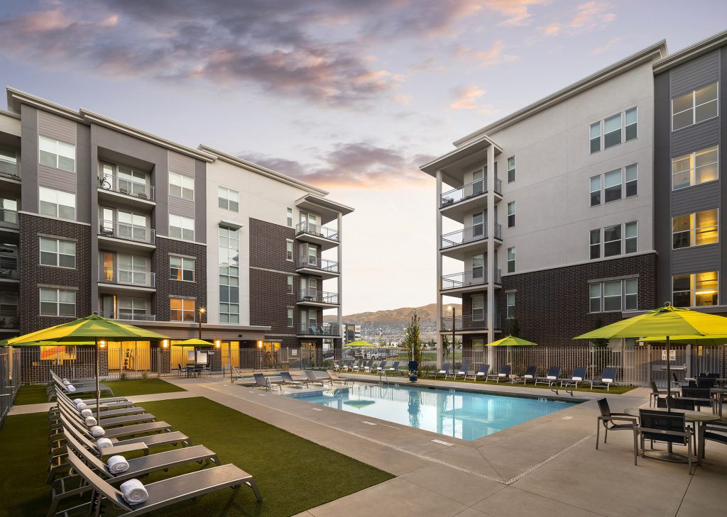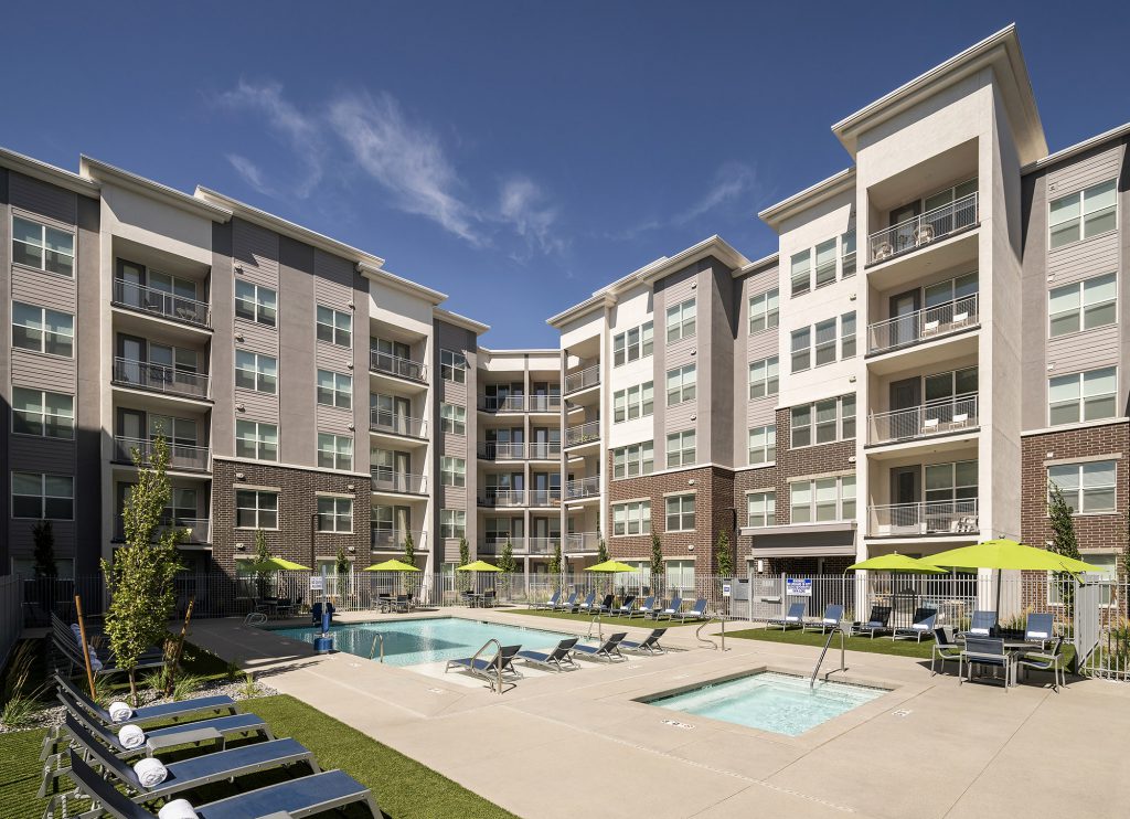 This apartment community offers a wide array of amenities and unforgettable views, proving that affordable designs can still have great detail and livable floor plans. Exterior finishes like stucco, siding and brick in simple patterns create a distinctly modern look without requiring complicated, expensive installation techniques. Minimalistic parapet elements add dimension along the roofline, and integrated balconies help the simple building footprint generate more visual interest. Community amenities include a spacious courtyard, pool, spa and fitness center.